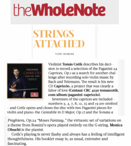 Violinist Tomás Cotik describes his decision to record a selection of the Paganini 24 Caprices, Op.1 as a search for another challenge after recording solo violin music by Bach and Telemann. The result is his new CD Capriccio, a project that was clearly a labor of love (Centaur CRC 4130 tomascotik.com/album/paganini-capriccio).